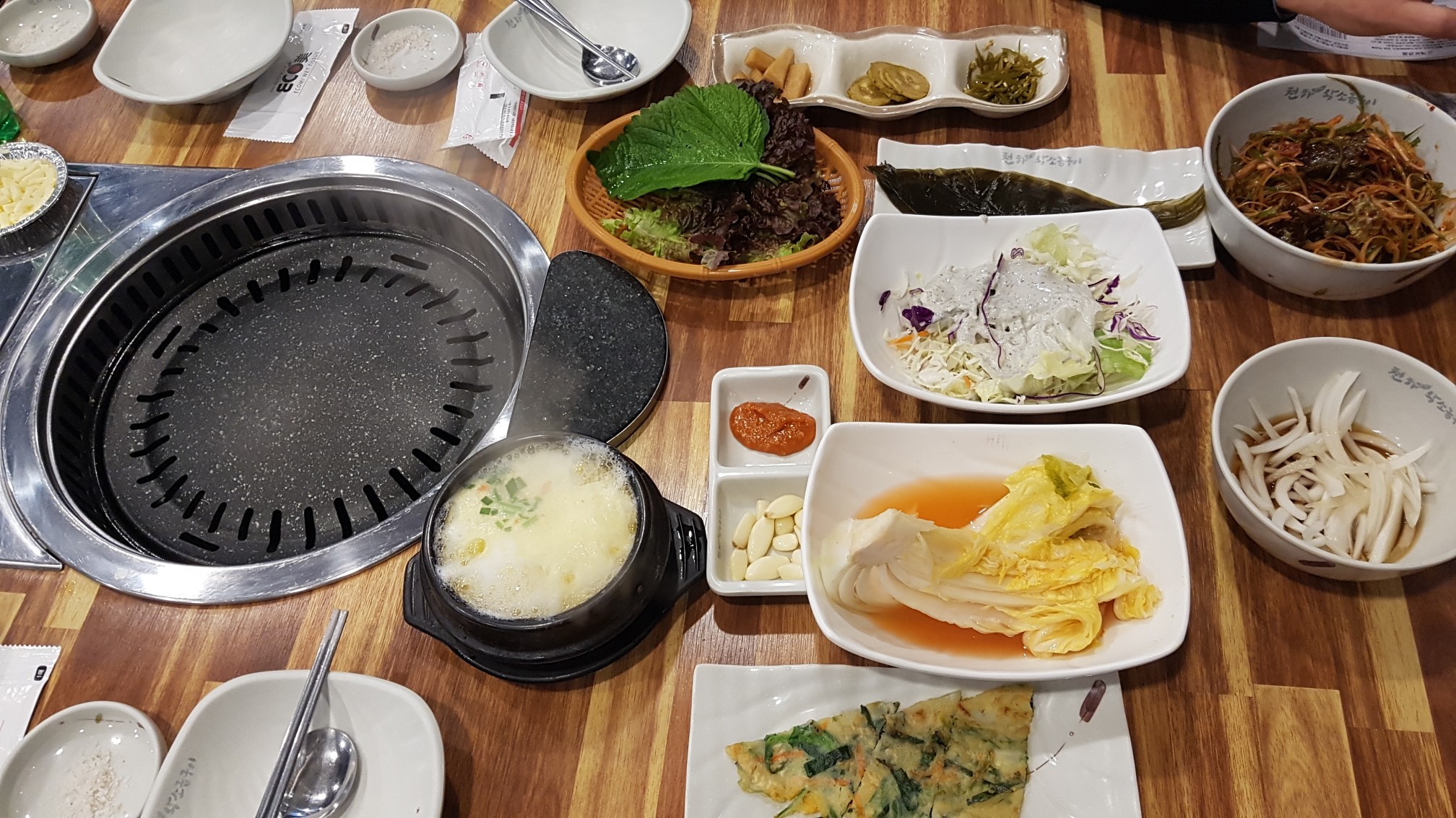 고기가 나오기 전 기본 상차림에 계란찜, 샐러드, 명이나물까지 고기와 곁들여 먹기에 좋은 깔끔한 밑반찬들이 세팅되어고기를 더욱더 맛나게 합니다.