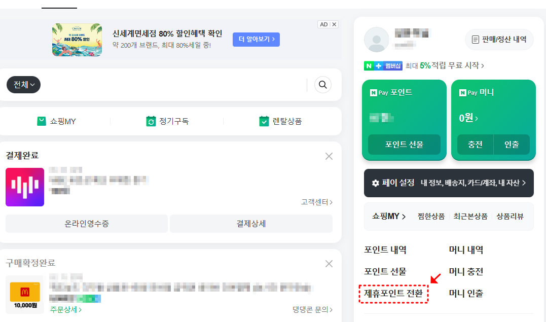 그러면 오른쪽 화면 아래에 "제휴포인트 전환"이라는 메뉴를 클릭합니다.